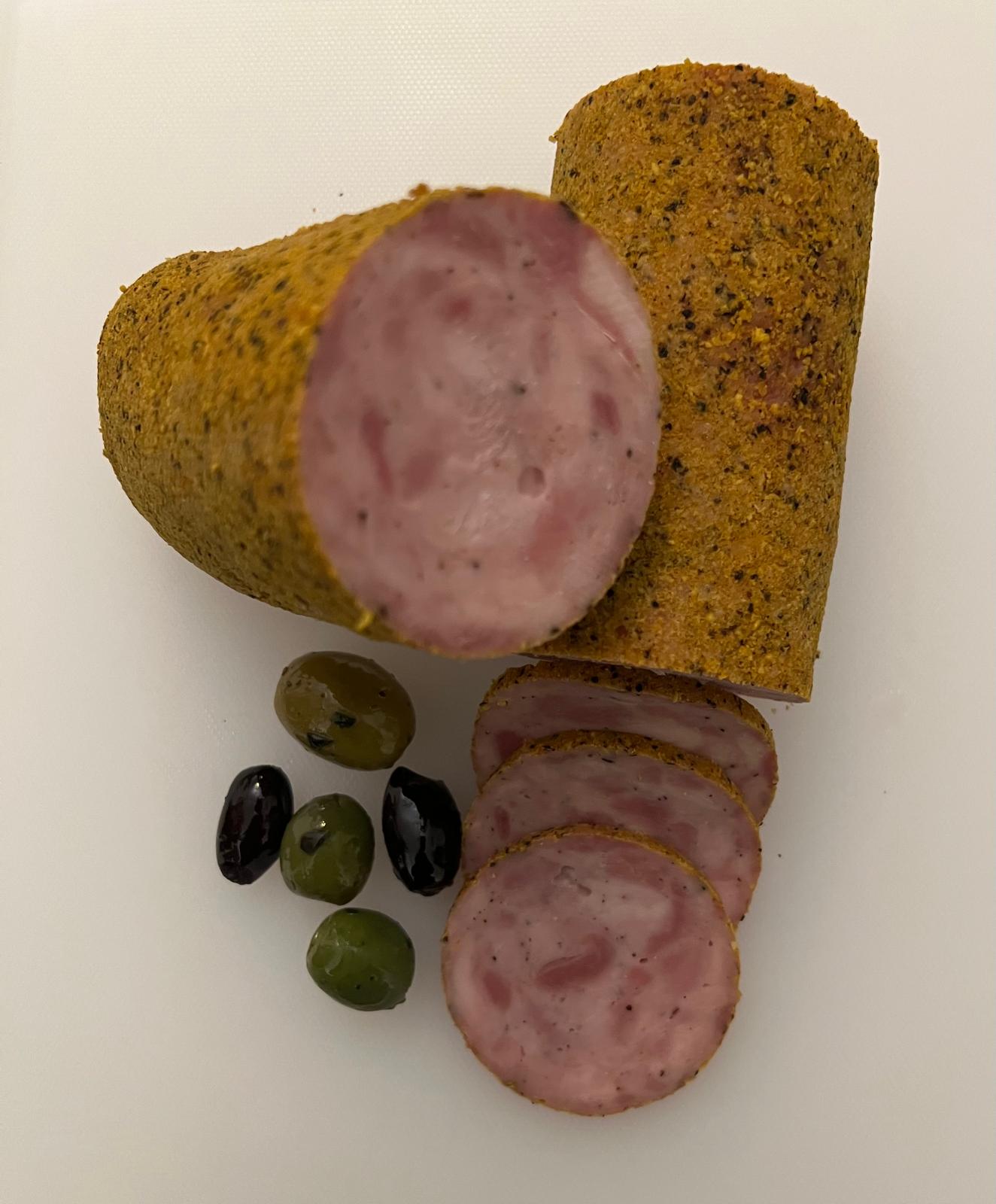 Ingrediente: pulpa curcan, piept curcan (origine Romania), sare, dextroza, condimente naturale, (contine faina de MUSTAR), lamaie si curry 0,15%